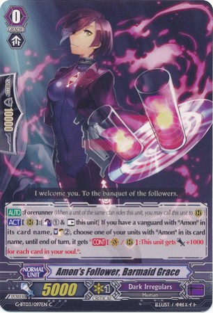 Texto (EN): [AUTO]:Forerunner (When a unit of the same clan rides this unit, you may call this unit to (RC)) [ACT](RC):[Counter Blast (1) & [Rest] this unit] If you have a vanguard with "Amon" in its card name, Soul Charge (2), choose one of your units with "Amon" in its card name, and until end of turn, it gets "[CONT](VC/RC):This unit gets [Power]+1000 for each card in your soul.".