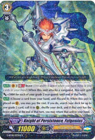 Texto (EN): [AUTO](VC) Generation Break 1 Brave (This ability is active when you have three or less cards in your hand):When this unit attacks a vanguard, this unit gets [Power]+5000 for each of your grade 2 rear-guards until end of that battle. [AUTO]:[Choose a card from your hand, and discard it] When this unit is placed on (VC), you may pay the cost. If you do, search your deck for up to one grade 2 card, call it to (RC), shuffle your deck, and if that unit has the brave ability, at the end of that turn, you may return that unit to your hand.