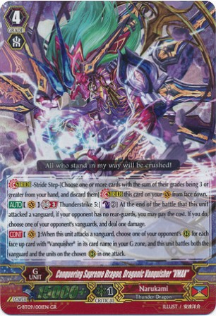 Texto (EN): [Stride]-Stride Step-[Choose one or more cards with the sum of their grades being 3 or greater from your hand, and discard them] Stride this card on your (VC) from face down. [AUTO](VC) Generation Break 3 Thunderstrike 5 (This ability is active when your opponent's bind zone has five or more cards):[Counter Blast (2)] At the end of the battle that this unit attacked a vanguard, if your opponent has no rear-guards, you may pay the cost. If you do, choose one of your opponent's vanguards, and deal one damage. [CONT](VC):When this unit attacks a vanguard, choose one of your opponent's (RC) for each face up card with "Vanquisher" in its card name in your G zone, and this unit battles both the vanguard and the units on the chosen (RC) in one attack.