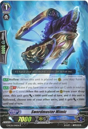 Texto (EN): [AUTO]:Hollow (When this unit is placed on (RC), you may have it become hollowed. If you do, retire it at the end of turn) [AUTO] Generation Break 1 (Active if you have one or more face up G units in total on your (VC) or G zone):When this unit is placed on (RC) from your drop zone, this unit gets [Power]+3000 until end of turn, and if this unit is hollowed, choose one of your other units, and it gets [Power]+3000 until end of turn.