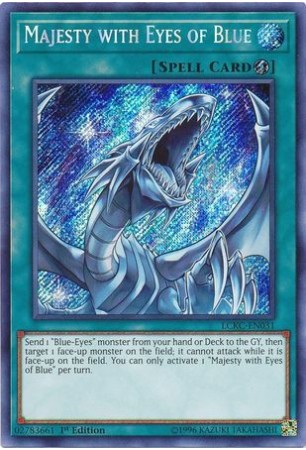 Texto (EN): Send 1 "Blue-Eyes" monster from your hand or Deck to the Graveyard, then target 1 face-up monster on the field; it cannot attack while it is face-up on the field. You can only activate 1 "Majesty with Eyes of Blue" per turn.
