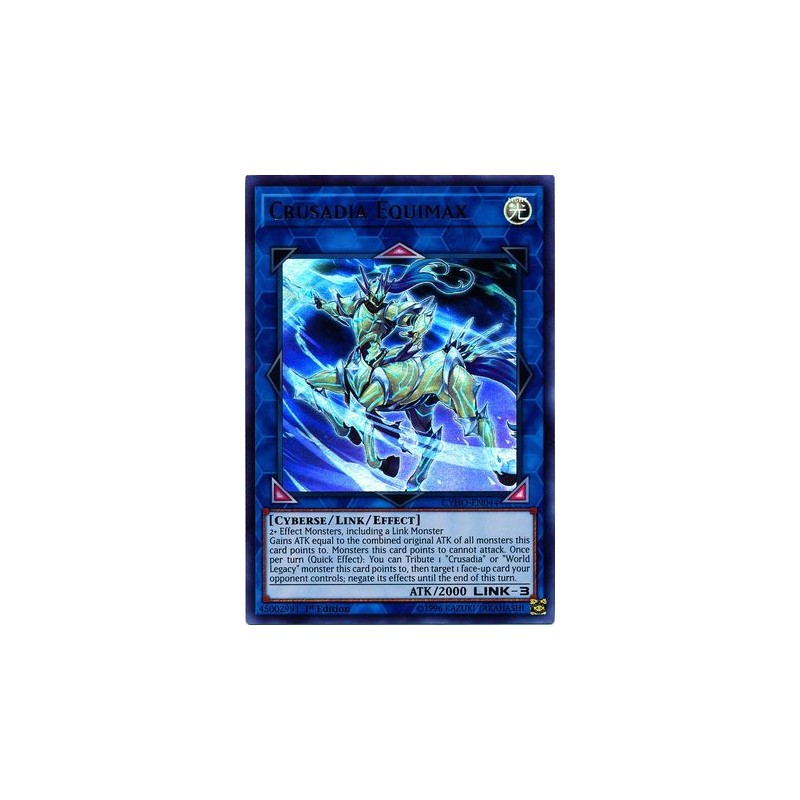 Texto (EN): 2+ Effect Monsters, including a Link Monster Gains ATK equal to the combined original ATK of all monsters this card points to. Monsters this card points to cannot attack. Once per turn (Quick Effect): You can Tribute 1 "Crusadia" or "World Legacy" monster this card points to, then target 1 face-up card your opponent controls; negate its effects until the end of this turn.