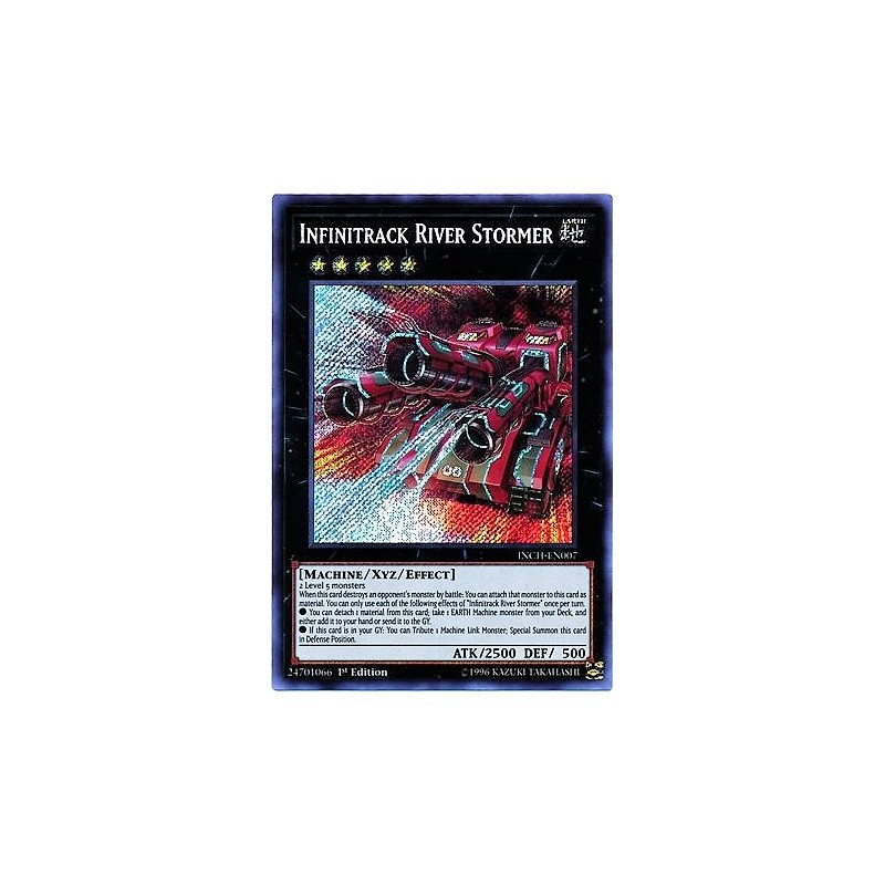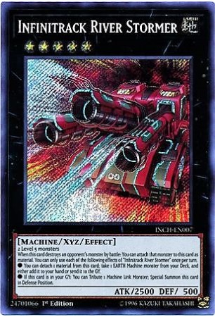 Texto (EN): 2 Level 5 monsters When this card destroys an opponent's monster by battle: You can attach that monster to this card as material. You can only use each of the following effects of “Infinitrack River Stormer” once per turn. ● You can detach 1 material from this card; take 1 EARTH Machine monster from your Deck, and either add it to your hand or send it to the GY. ● If this card is in your GY: You can Tribute 1 Machine Link Monster; Special Summon this card in Defense Position.
