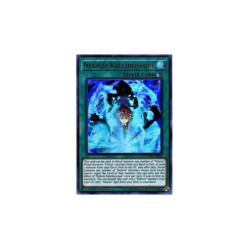 Texto (EN): This card can be used to Ritual Summon any number of "Nekroz" Ritual Monsters. Tribute 1 monster from your hand or field, or send 1 monster from your Extra Deck to the Graveyard, also, after that, Ritual Summon any number of "Nekroz" monsters whose total Levels exactly equal the Level of that monster. You can only use this effect of "Nekroz Kaleidoscope" once per turn. If you control no monsters: You can banish this card and 1 "Nekroz" monster from your Graveyard; add 1 "Nekroz" Spell Card from your Deck to your hand.