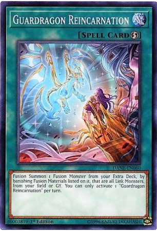 Texto (EN): Fusion Summon 1 Fusion Monster from your Extra Deck, by banishing Link Monsters listed on it from your field or GY as Fusion Material. You can only activate 1 "Guardragon Reincarnation" per turn.