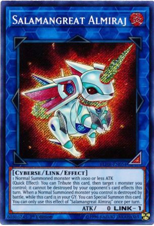 Texto (EN): 1 Normal Summoned monster with 1000 or less ATK (Quick Effect): You can Tribute this card, then target 1 monster you control; it cannot be destroyed by your opponent's card effects this turn. When a Normal Summoned monster you control is destroyed by battle, while this card is in your GY: You can Special Summon this card from your GY. You can only use this effect of "Salamangreat Almiraj" once per turn.