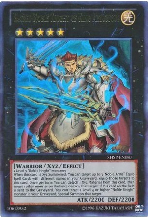 Texto (EN): 2 Level 5 "Noble Knight" monsters When this card is Xyz Summoned: You can target up to 3 "Noble Arms" Equip Spell Cards with different names in your Graveyard; equip those targets to this card. Once per turn: You can detach 1 Xyz Material from this card, then target 1 other monster on the field; destroy that target. If this card is sent from the field to the Graveyard: You can target 1 Level 4 or higher "Noble Knight" monster in your Graveyard; Special Summon that target.