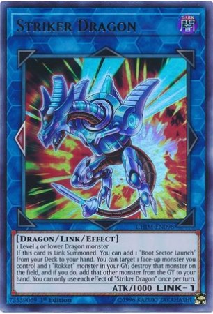 Texto (EN): 1 Level 4 or lower Dragon monster If this card is Link Summoned: You can add 1 "Boot Sector Launch" from your Deck to your hand. You can target 1 face-up monster you control and 1 "Rokket" monster in your GY; destroy the first target, and if you do, add the second target to your hand. You can only use each effects of "Striker Dragon" once per turn.