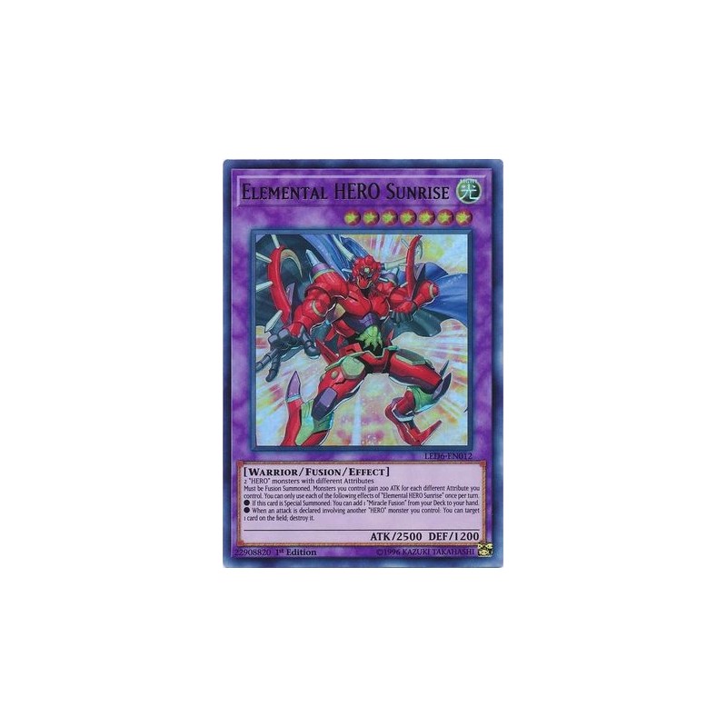 Texto (EN): 2 "HERO" monsters with different Attributes Must be Fusion Summoned. Monsters you control gain 200 ATK for each different Attribute you control. You can only use each of the following effects of "Elemental HERO Sunrise" once per turn. ● If this card is Special Summoned: You can add 1 "Miracle Fusion" from your Deck to your hand. ● When an attack is declared involving another "HERO" monster you control: You can target 1 card on the field; destroy it.