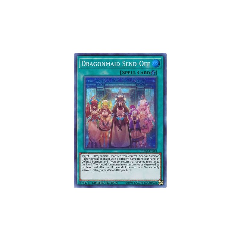 Texto (EN): Target 1 "Dragonmaid" monster you control; Special Summon 1 "Dragonmaid" monster with a different name from your hand, in Defense Position, and if you do, return that targeted monster to the hand. The Special Summoned monster cannot be destroyed by battle or card effects until the end of the next turn. You can only activate 1 "Dragonmaid Send-Off" per turn.
