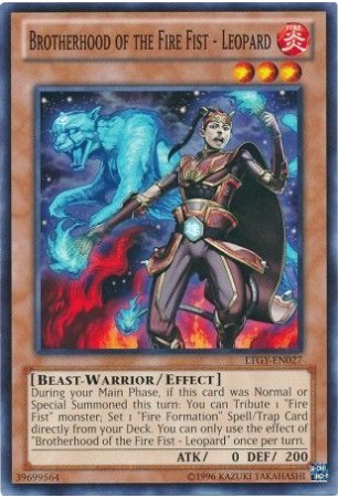 Texto (EN): During your Main Phase, if this card was Normal or Special Summoned this turn: You can Tribute 1 "Fire Fist" monster; Set 1 "Fire Formation" Spell/Trap Card directly from your Deck. You can only use the effect of "Brotherhood of the Fire Fist - Leopard" once per turn.