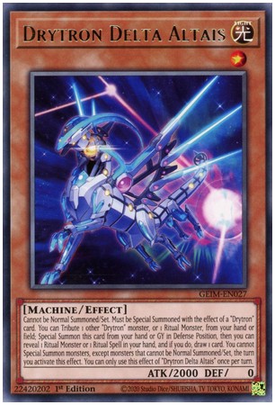 Texto (EN): Cannot be Normal Summoned/Set. Must be Special Summoned with the effect of a "Drytron" card. You can Tribute 1 other "Drytron" monster, or 1 Ritual Monster, from your hand or field; Special Summon this card from your hand or GY in Defense Position, then you can reveal 1 Ritual Monster or 1 Ritual Spell in your hand, and if you do, draw 1 card. You cannot Special Summon monsters, except monsters that cannot be Normal Summoned/Set, the turn you activate this effect. You can only use this effect of "Drytron Delta Altais" once per turn.