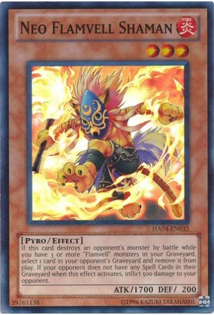 Texto (EN): If this card destroys an opponent's monster by battle while you have 3 or more "Flamvell" monsters in your Graveyard, select 1 card in your opponent's Graveyard and remove it from play. If your opponent does not have any Spell Cards in their Graveyard when this effect activates, inflict 500 damage to your opponent.