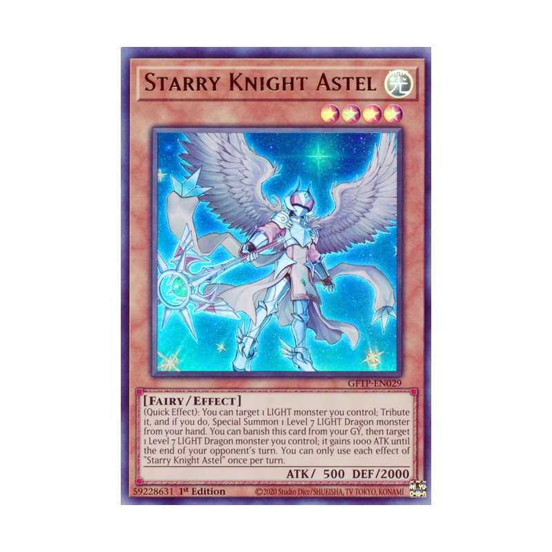 Texto (EN): (Quick Effect): You can target 1 LIGHT monster you control; Tribute it, and if you do, Special Summon 1 Level 7 LIGHT Dragon monster from your hand. You can banish this card from your GY, then target 1 Level 7 LIGHT Dragon monster you control; it gains 1000 ATK until the end of your opponent's turn. You can only use each effect of "Starry Knight Astel" once per turn.
