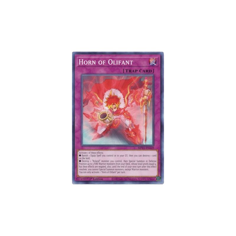 Texto (EN): Activate 1 of these effects; ● Banish 1 Equip Spell you control or in your GY, then you can destroy 1 card on the field. ● Destroy 1 "Roland" monster you control, then Special Summon in Defense Position up to 3 FIRE Warrior monsters from your Deck, whose total Levels equal 9, but their effects are negated, also, until the end of your next turn after this effect resolves, you cannot Special Summon monsters, except Warrior monsters. You can only activate 1 "Horn of Olifant" per turn.