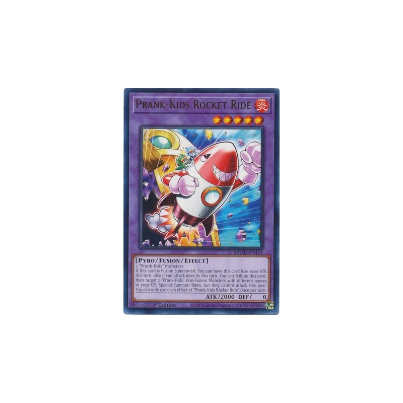 Texto (EN): 2 "Prank-Kids" monsters If this card is Fusion Summoned: You can have this card lose 1000 ATK this turn, also it can attack directly this turn. You can Tribute this card, then target 2 "Prank-Kids" non-Fusion Monsters with different names in your GY; Special Summon them, but they cannot attack this turn. You can only use each effect of "Prank-Kids Rocket Ride" once per turn.