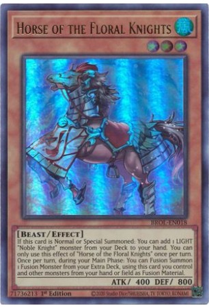 Texto (EN): If this card is Normal or Special Summoned: You can add 1 LIGHT "Noble Knight" monster from your Deck to your hand. You can only use this effect of "Horse of the Floral Knights" once per turn. Once per turn: You can Fusion Summon 1 Fusion Monster from your Extra Deck, using this card you control and other monsters from your hand or field as Fusion Material.