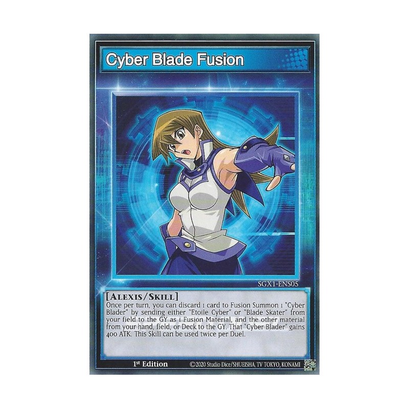 Texto (EN): Skill activation Flip this card over when you activate this Skill. Effect Once per turn, you can discard 1 card to Fusion Summon 1 "Cyber Blader" by sending either "Etoile Cyber" or "Blade Skater" from your field to the GY as 1 Fusion Material, and the other material from your hand, field, or Deck to the GY. That "Cyber Blader" gains 400 ATK. This Skill can be used twice per Duel.