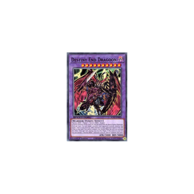 Texto (EN): "Destiny HERO - Plasma" + "Destiny HERO - Dogma" A Fusion Summon of this card can only be done with the above Fusion Materials. Once per turn: You can target 1 monster your opponent controls; destroy that target, and if it was face-up, inflict damage to your opponent equal to the ATK it had on the field. You cannot conduct your Battle Phase the turn you activate this effect. Once per turn, during your Standby Phase, if this card is in your GY: You can banish 1 "Destiny HERO" card from your GY; Special Summon this card.
