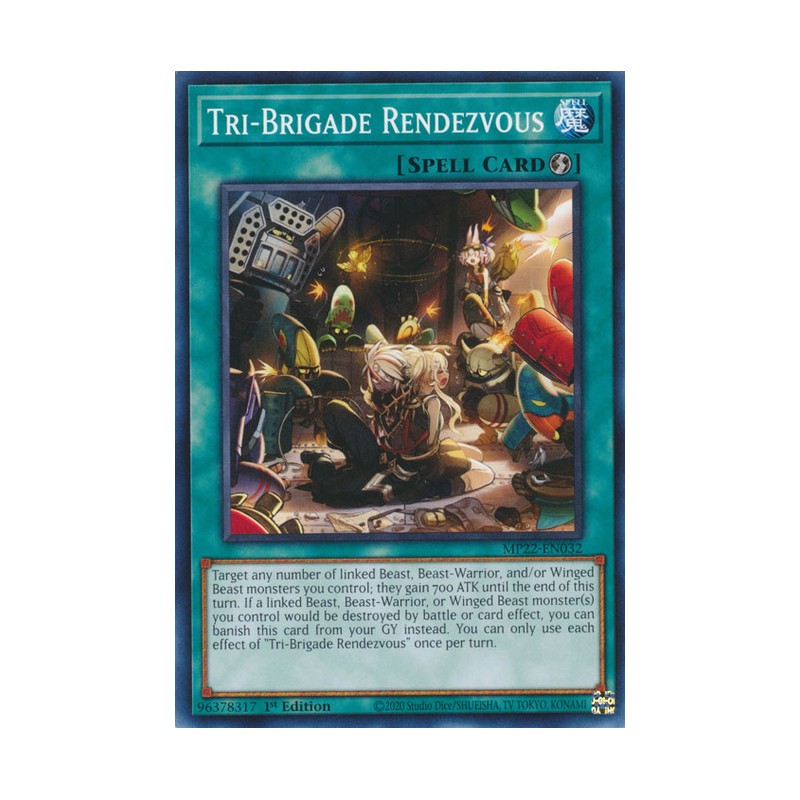 Texto (EN): Target any number of linked Beast, Beast-Warrior, and/or Winged Beast monsters you control; they gain 700 ATK until the end of this turn. If a linked Beast, Beast-Warrior, or Winged Beast monster(s) you control would be destroyed by battle or card effect, you can banish this card from your GY instead. You can only use each effect of "Tri-Brigade Rendezvous" once per turn.