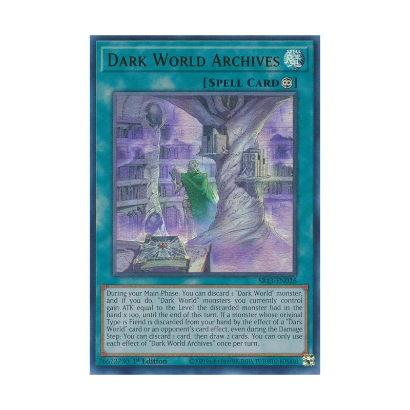 Texto (EN): During your Main Phase: You can discard 1 "Dark World" monster, and if you do, "Dark World" monsters you currently control gain ATK equal to the Level the discarded monster had in the hand x 100, until the end of this turn. If a monster whose original Type is Fiend is discarded from your hand by the effect of a "Dark World" card or an opponent's card effect, even during the Damage Step: You can discard 1 card, then draw 2 cards. You can only use each effect of "Dark World Archives" once per turn.