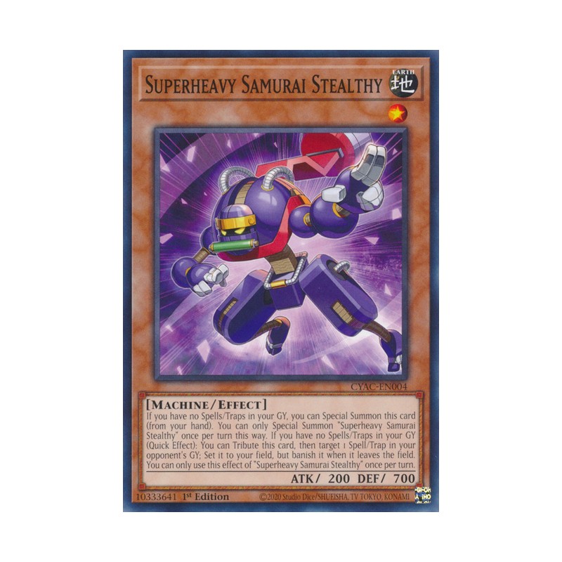 Texto (EN): If you have no Spells/Traps in your GY, you can Special Summon this card (from your hand). You can only Special Summon "Superheavy Samurai Stealthy" once per turn this way. If you have no Spells/Traps in your GY (Quick Effect): You can Tribute this card, then target 1 Spell/Trap in your opponent's GY; Set it to your field, but banish it when it leaves the field. You can only use this effect of "Superheavy Samurai Stealthy" once per turn.