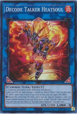 Texto (EN): 2+ Cyberse monsters with different Attributes Gains 500 ATK for each monster it points to. (Quick Effect): You can pay 1000 LP; draw 1 card, then if your LP are 2000 or less, you can apply this effect. ● Banish this card from the field, and if you do, Special Summon 1 Link-3 or lower Cyberse monster from your Extra Deck, except "Decode Talker Heatsoul". You can only use this effect of "Decode Talker Heatsoul" once per turn.