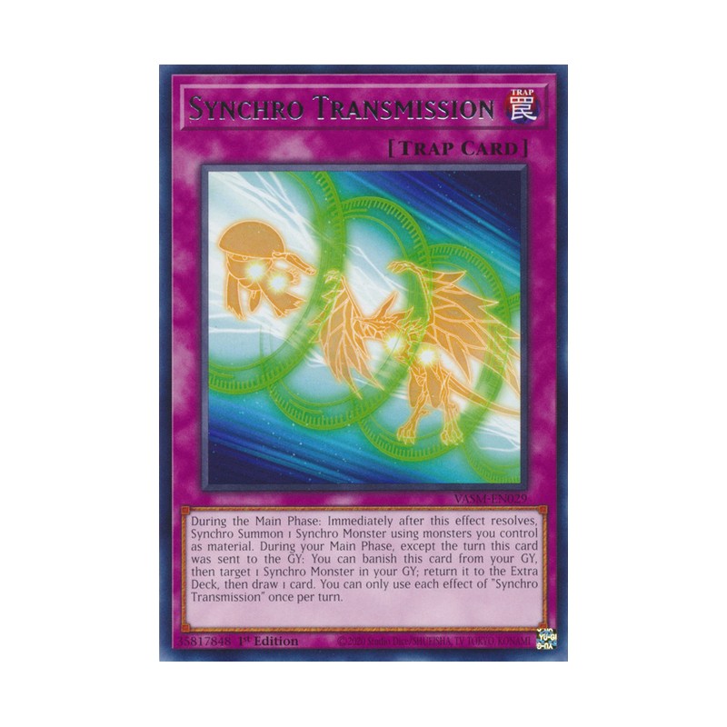 Texto (EN): During the Main Phase: Immediately after this effect resolves, Synchro Summon 1 Synchro Monster using monsters you control as material. During your Main Phase, except the turn this card was sent to the GY: You can banish this card from your GY, then target 1 Synchro Monster in your GY; return it to the Extra Deck, then draw 1 card. You can only use each effect of "Synchro Transmission" once per turn.