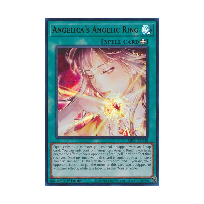 Texto (EN): Equip only to a monster you control equipped with an Equip Card. You can only control 1 "Angelica's Angelic Ring". Each turn, negate the effect of your opponent's first Spell Card or effect that resolves. Once per turn, while this card is equipped to a monster: You can gain 500 LP, then destroy this card, and if you do, your opponent cannot target the monster this card was equipped to with card effects, while it is face-up in the Monster Zone.