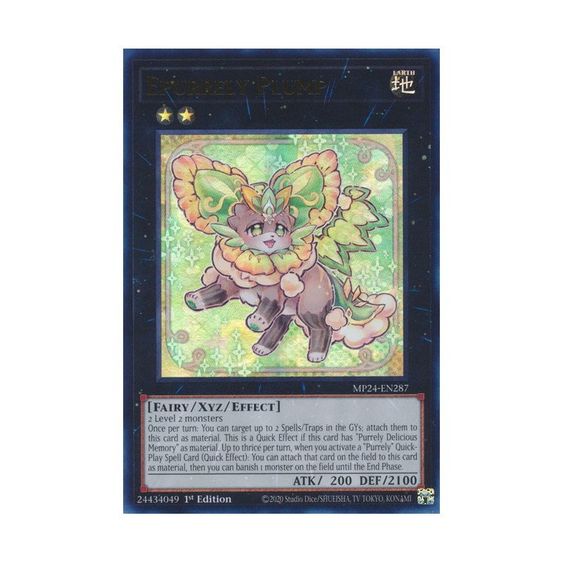 Texto (EN): 2 Level 2 monsters Once per turn: You can target up to 2 Spells/Traps in the GYs; attach them to this card as material. This is a Quick Effect if this card has "Purrely Delicious Memory" as material. Up to thrice per turn, when you activate a "Purrely" Quick-Play Spell Card (Quick Effect): You can attach that card on the field to this card as material, then you can banish 1 monster on the field until the End Phase.