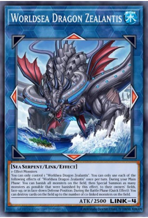 Texto (EN): 1+ Effect Monsters You can only control 1 "Worldsea Dragon Zealantis". You can only use each of the following effects of "Worldsea Dragon Zealantis" once per turn. During your Main Phase: You can banish all monsters on the field, then Special Summon as many monsters as possible that were banished by this effect, to their owners' fields, face-up, or in face-down Defense Position. During the Battle Phase (Quick Effect): You can destroy cards on the field up to the number of co-linked monsters on the field.