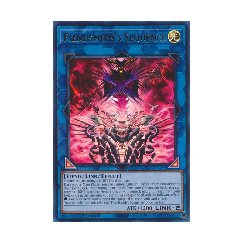 Texto (EN): 2 monsters, including a LIGHT Fiend monster During your Main Phase: You can Fusion Summon 1 Fiend Fusion Monster from your Extra Deck, by shuffling its materials from your GY into the Deck. You can target 1 LIGHT non-Link Fiend monster you control; equip this card from your field or GY to that monster you control as an Equip Spell with the following effect. ● Your opponent cannot target the equipped monster with card effects. You can only use each effect of "Fiendsmith's Sequence" once per turn.