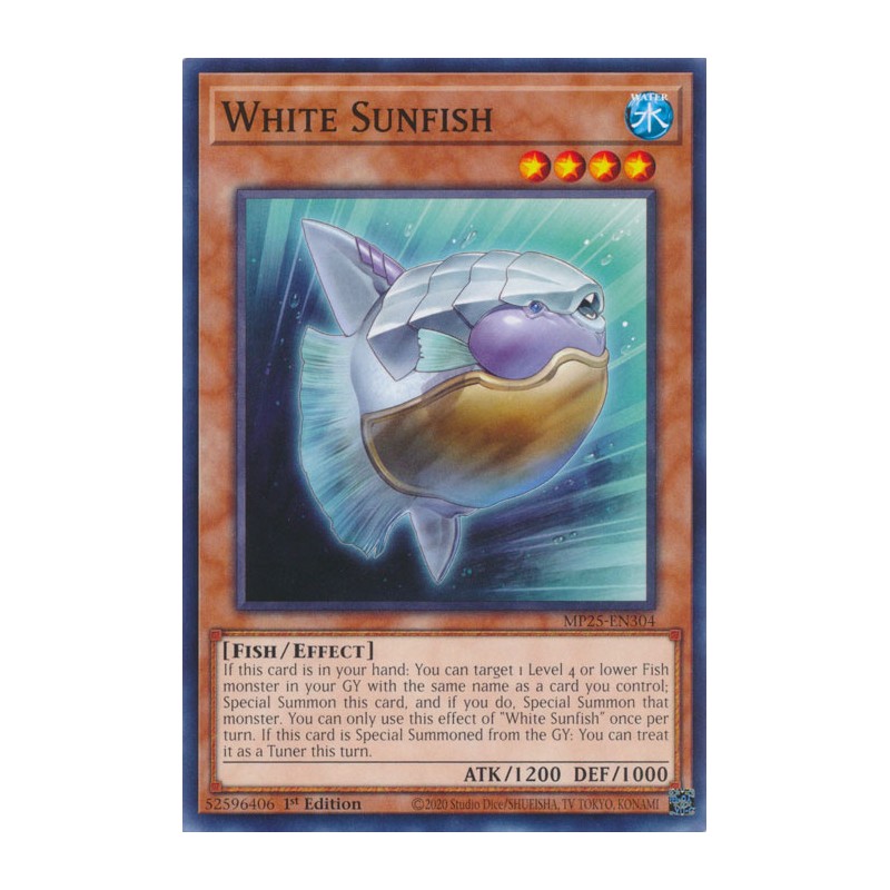 Texto (EN): If this card is in your hand: You can target 1 Level 4 or lower Fish monster in your GY with the same name as a card you control; Special Summon this card, and if you do, Special Summon that monster. You can only use this effect of "White Sunfish" once per turn. If this card is Special Summoned from the GY: You can treat it as a Tuner this turn.