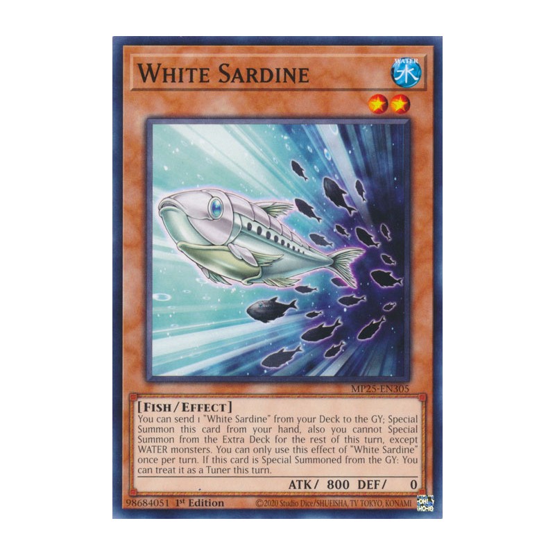 Texto (EN): You can send 1 "White Sardine" from your Deck to the GY; Special Summon this card from your hand, also you cannot Special Summon from the Extra Deck for the rest of this turn, except WATER monsters. You can only use this effect of "White Sardine" once per turn. If this card is Special Summoned from the GY: You can treat it as a Tuner this turn.