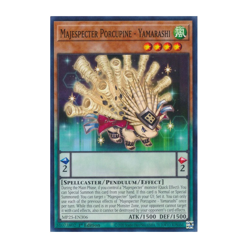 Texto (EN): During the Main Phase, if you control a "Majespecter" monster (Quick Effect): You can Special Summon this card from your hand. If this card is Normal or Special Summoned: You can target 1 "Majespecter" Spell in your GY; Set it. You can only use each of the previous effects of "Majespecter Porcupine - Yamarashi" once per turn. While this card is in your Monster Zone, your opponent cannot target it with card effects, also it cannot be destroyed by your opponent's card effects.