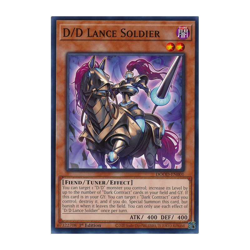 Texto (EN): You can target 1 "D/D" monster you control; increase its Level by up to the number of "Dark Contract" cards in your field and GY. If this card is in your GY: You can target 1 "Dark Contract" card you control; destroy it, and if you do, Special Summon this card, but banish it when it leaves the field. You can only use each effect of "D/D Lance Soldier" once per turn.
