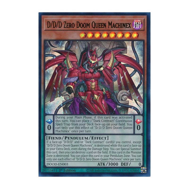 Texto (EN): Pendulum Effect During your Main Phase, if this card was activated this turn: You can place 1 "Dark Contract" Continuous Spell/Trap from your Deck face-up on your field. You can only use this effect of "D/D/D Zero Doom Queen Machinex" once per turn. Monster Effect If a face-up "D/D/D" and/or "Dark Contract" card(s) you control, except "D/D/D Zero Doom Queen Machinex", is destroyed while this card is face-up in your Extra Deck, even during the Damage Step: You can Special Summon this card, then you can destroy 1 card on the field. If this card in the Monster Zone is destroyed: You can place this card in your Pendulum Zone. You can only use each effect of "D/D/D Zero Doom Queen Machinex" once per turn.