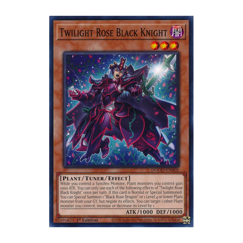Texto (EN): While you control a Synchro Monster, Plant monsters you control gain 1000 ATK. You can only use each of the following effects of "Twilight Rose Black Knight" once per turn. If this card is Normal or Special Summoned: You can Special Summon 1 "Black Rose Dragon" or 1 Level 4 or lower Plant monster from your GY, but negate its effects. You can target 1 other Plant monster you control; increase or decrease its Level by 1.