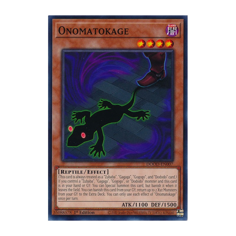 Texto (EN): (This card is always treated as a "Zubaba", "Gagaga", "Gogogo", and "Dododo" card.) If you control a "Zubaba", "Gagaga", "Gogogo", or "Dododo" monster and this card is in your hand or GY: You can Special Summon this card, but banish it when it leaves the field. You can banish this card from your GY; return up to 2 Xyz Monsters from your GY to the Extra Deck. You can only use each effect of "Onomatokage" once per turn.
