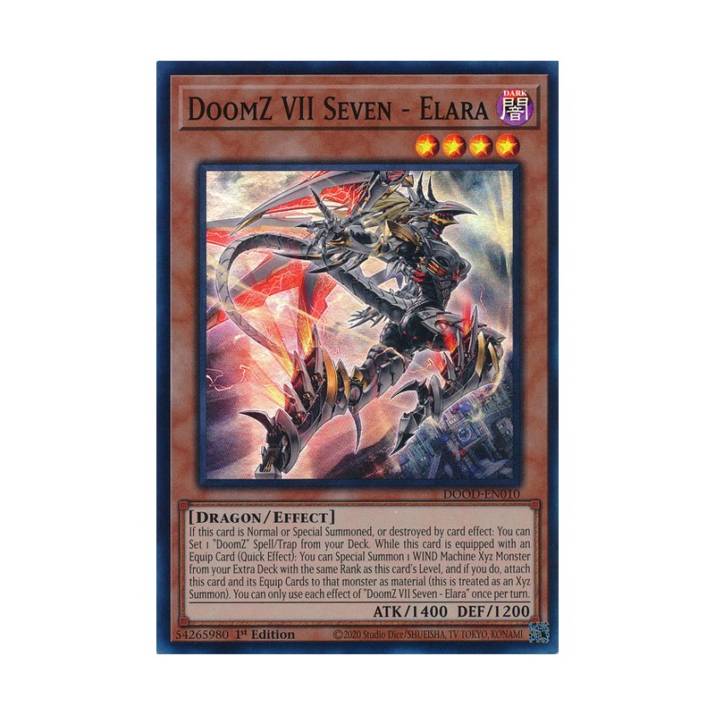 Texto (EN): If this card is Normal or Special Summoned, or destroyed by card effect: You can Set 1 "DoomZ" Spell/Trap from your Deck. While this card is equipped with an Equip Card (Quick Effect): You can Special Summon 1 WIND Machine Xyz Monster from your Extra Deck with the same Rank as this card's Level, and if you do, attach this card and its Equip Cards to that monster as material (this is treated as an Xyz Summon). You can only use each effect of "DoomZ VII Seven - Elara" once per turn.