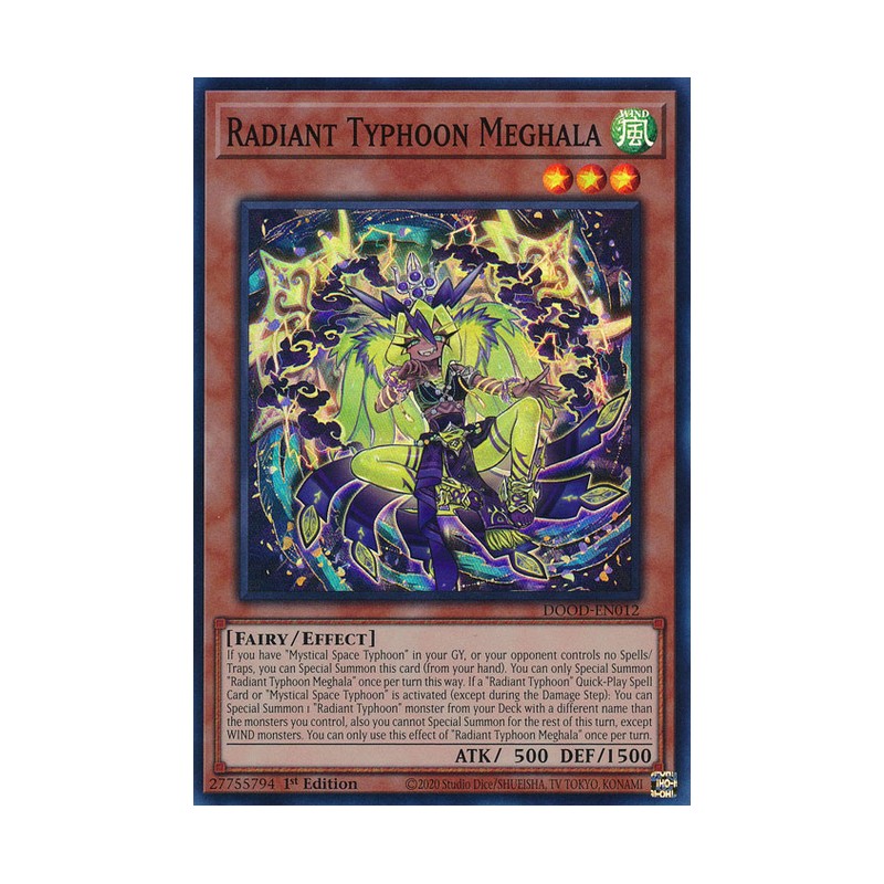 Texto (EN): If you have "Mystical Space Typhoon" in your GY, or your opponent controls no Spells/Traps, you can Special Summon this card (from your hand). You can only Special Summon "Radiant Typhoon Meghala" once per turn this way. If a "Radiant Typhoon" Quick-Play Spell Card or "Mystical Space Typhoon" is activated (except during the Damage Step): You can Special Summon 1 "Radiant Typhoon" monster from your Deck with a different name than the monsters you control, also you cannot Special Summon for the rest of this turn, except WIND monsters. You can only use this effect of "Radiant Typhoon Meghala" once per turn.