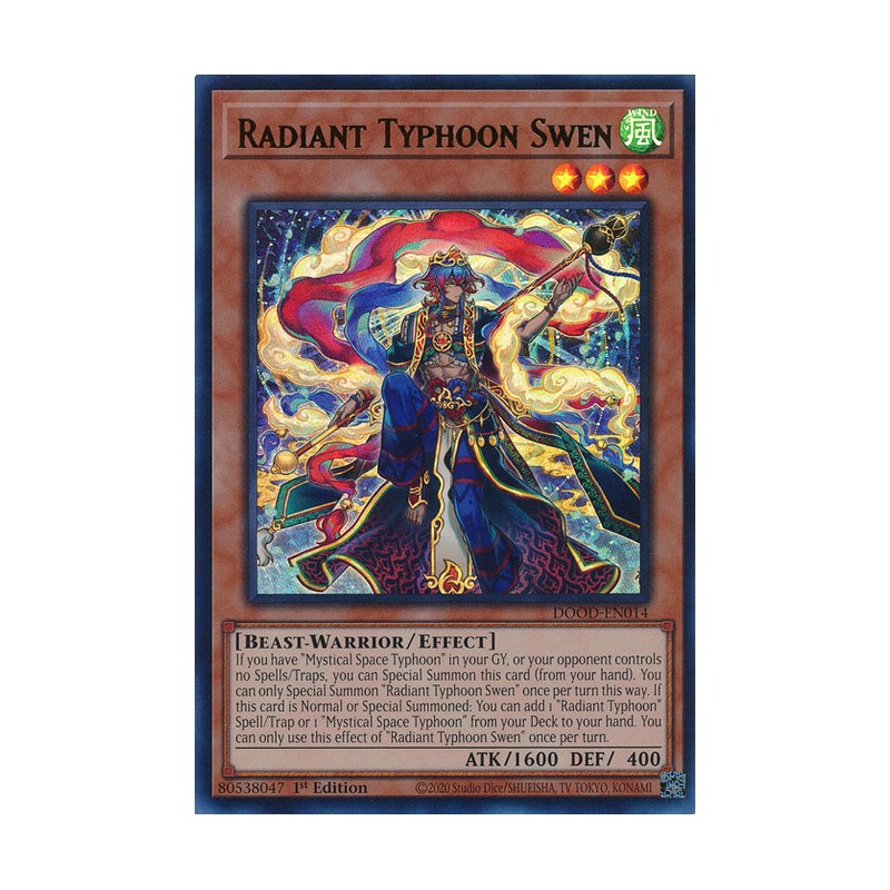 Texto (EN): If you have "Mystical Space Typhoon" in your GY, or your opponent controls no Spells/Traps, you can Special Summon this card (from your hand). You can only Special Summon "Radiant Typhoon Swen" once per turn this way. If this card is Normal or Special Summoned: You can add 1 "Radiant Typhoon" Spell/Trap or 1 "Mystical Space Typhoon" from your Deck to your hand. You can only use this effect of "Radiant Typhoon Swen" once per turn.