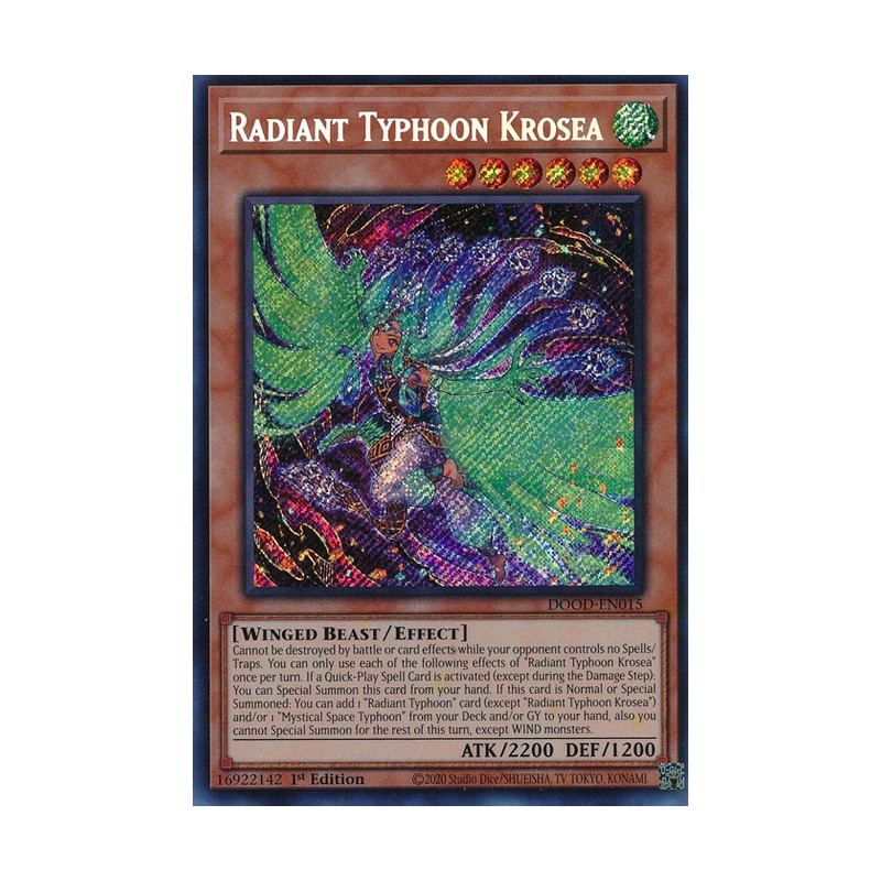 Texto (EN): Cannot be destroyed by battle or card effects while your opponent controls no Spells/Traps. You can only use each of the following effects of "Radiant Typhoon Krosea" once per turn. If a Quick-Play Spell Card is activated (except during the Damage Step): You can Special Summon this card from your hand. If this card is Normal or Special Summoned: You can add 1 "Radiant Typhoon" card (except "Radiant Typhoon Krosea") and/or 1 "Mystical Space Typhoon" from your Deck and/or GY to your hand, also you cannot Special Summon for the rest of this turn, except WIND monsters.