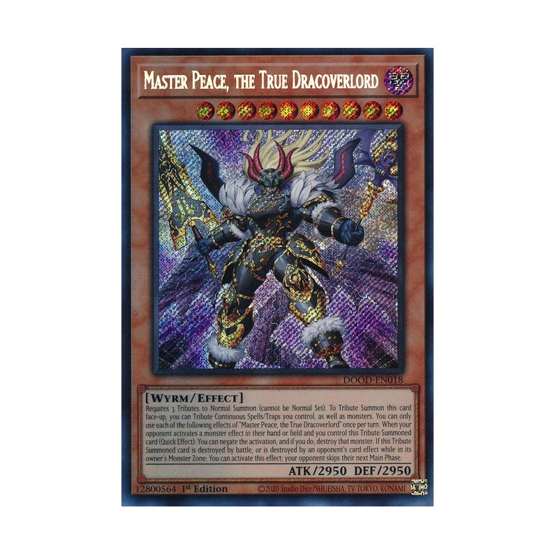 Texto (EN): Requires 3 Tributes to Normal Summon (cannot be Normal Set). To Tribute Summon this card face-up, you can Tribute Continuous Spells/Traps you control, as well as monsters. You can only use each of the following effects of "Master Peace, the True Dracoverlord" once per turn. When your opponent activates a monster effect in their hand or field and you control this Tribute Summoned card (Quick Effect): You can negate the activation, and if you do, destroy that monster. If this Tribute Summoned card is destroyed by battle, or is destroyed by an opponent's card effect while in its owner's Monster Zone: You can activate this effect; your opponent skips their next Main Phase.