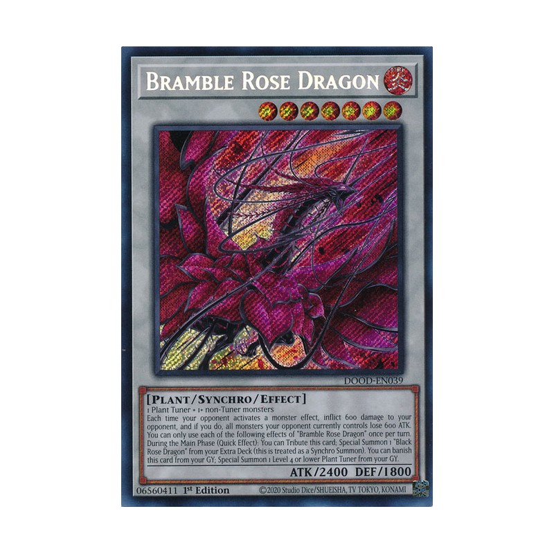 Texto (EN): 1 Plant Tuner + 1+ non-Tuner monsters Each time your opponent activates a monster effect, inflict 600 damage to your opponent, and if you do, all monsters your opponent currently controls lose 600 ATK. You can only use each of the following effects of "Bramble Rose Dragon" once per turn. During the Main Phase (Quick Effect): You can Tribute this card; Special Summon 1 "Black Rose Dragon" from your Extra Deck (this is treated as a Synchro Summon). You can banish this card from your GY; Special Summon 1 Level 4 or lower Plant Tuner from your GY.