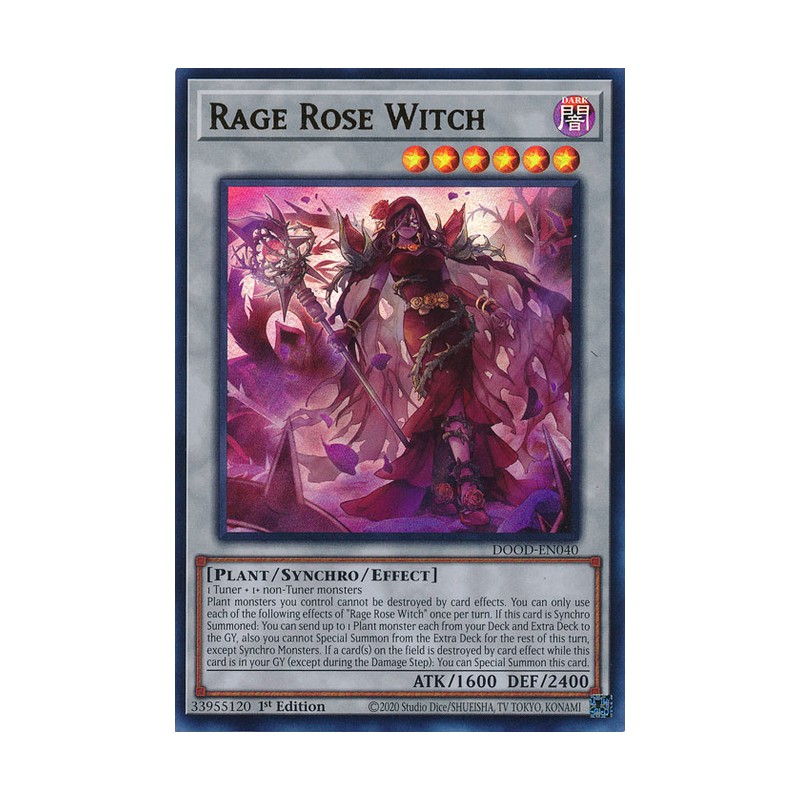 Texto (EN): 1 Tuner + 1+ non-Tuner monsters Plant monsters you control cannot be destroyed by card effects. You can only use each of the following effects of "Rage Rose Witch" once per turn. If this card is Synchro Summoned: You can send up to 1 Plant monster each from your Deck and Extra Deck to the GY, also you cannot Special Summon from the Extra Deck for the rest of this turn, except Synchro Monsters. If a card(s) on the field is destroyed by card effect while this card is in your GY (except during the Damage Step): You can Special Summon this card.