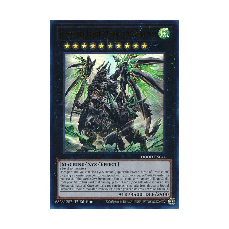 Texto (EN): 3 Level 10 monsters Once per turn, you can also Xyz Summon "Jupiter the Power Patron of Destruction" by using 1 monster you control equipped with 3 or more Equip Cards (transfer its materials). If this card is Xyz Summoned: You can equip any number of Equip Spells from your GY to this card that can equip to it. Gains 3000 ATK while it has an Xyz Monster as material. Once per turn: You can detach 1 material from this card; Special Summon 1 "DoomZ" monster from your GY, then you can destroy 1 card on the field.