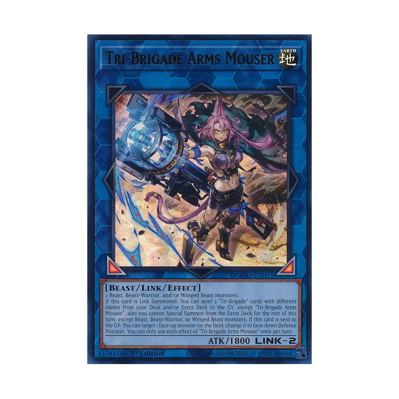 Texto (EN): 2 Beast, Beast-Warrior, and/or Winged Beast monsters If this card is Link Summoned: You can send 2 "Tri-Brigade" cards with different names from your Deck and/or Extra Deck to the GY, except "Tri-Brigade Arms Mouser", also you cannot Special Summon from the Extra Deck for the rest of this turn, except Beast, Beast-Warrior, or Winged Beast monsters. If this card is sent to the GY: You can target 1 face-up monster on the field; change it to face-down Defense Position. You can only use each effect of "Tri-Brigade Arms Mouser" once per turn.