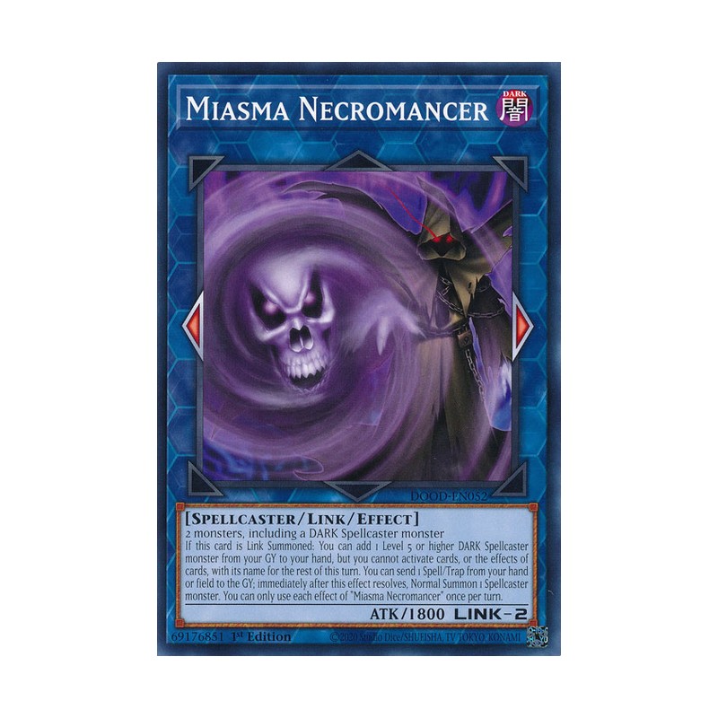 Texto (EN): 2 monsters, including a DARK Spellcaster monster If this card is Link Summoned: You can add 1 Level 5 or higher DARK Spellcaster monster from your GY to your hand, but you cannot activate cards, or the effects of cards, with its name for the rest of this turn. You can send 1 Spell/Trap from your hand or field to the GY; immediately after this effect resolves, Normal Summon 1 Spellcaster monster. You can only use each effect of "Miasma Necromancer" once per turn.