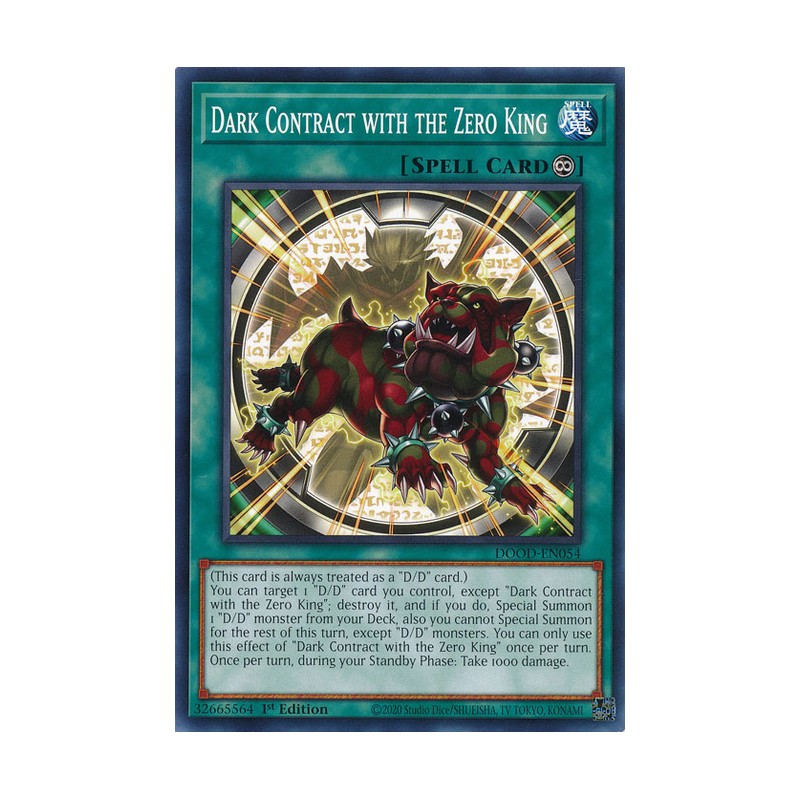 Texto (EN): (This card is always treated as a "D/D" card.) You can target 1 "D/D" card you control, except "Dark Contract with the Zero King"; destroy it, and if you do, Special Summon 1 "D/D" monster from your Deck, also you cannot Special Summon for the rest of this turn, except "D/D" monsters. You can only use this effect of "Dark Contract with the Zero King" once per turn. Once per turn, during your Standby Phase: Take 1000 damage.